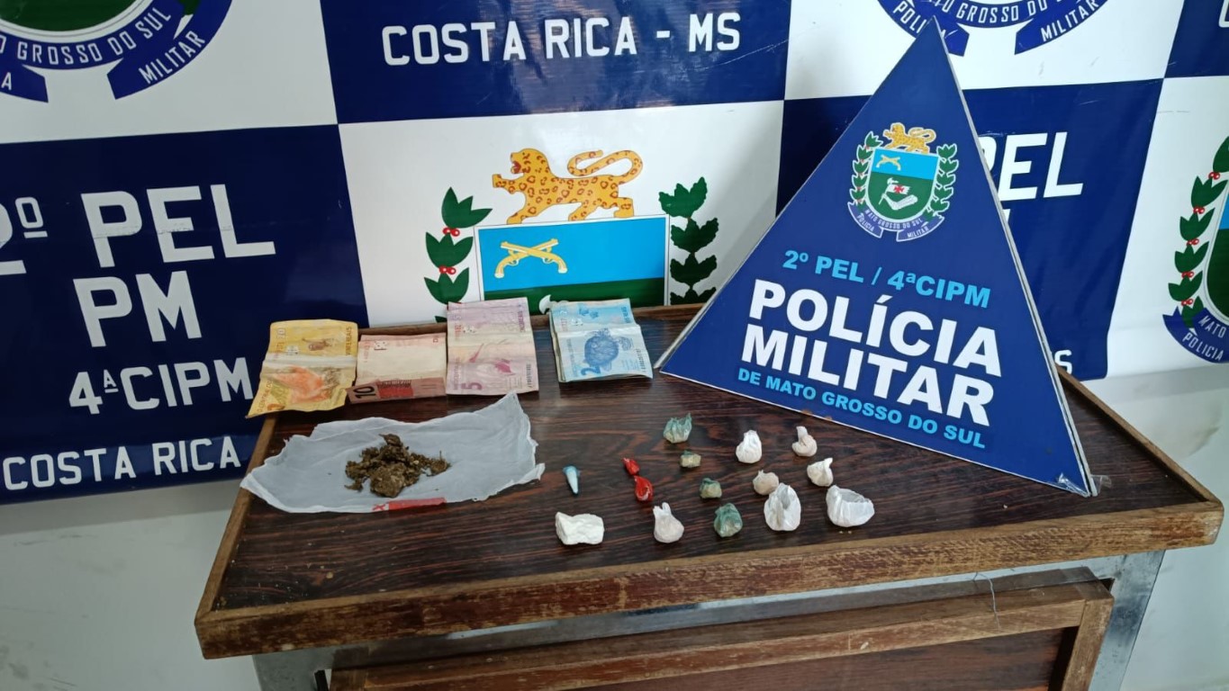Em Costa Rica, a guarnição realizou rondas após denúncias de venda de drogas em região específica e abordou um homem que portava 5 g de cocaína, 4,9 g de pasta base e 3,9 g de maconha. A equipe seguiu ao endereço do suspeito para continuidade das buscas.