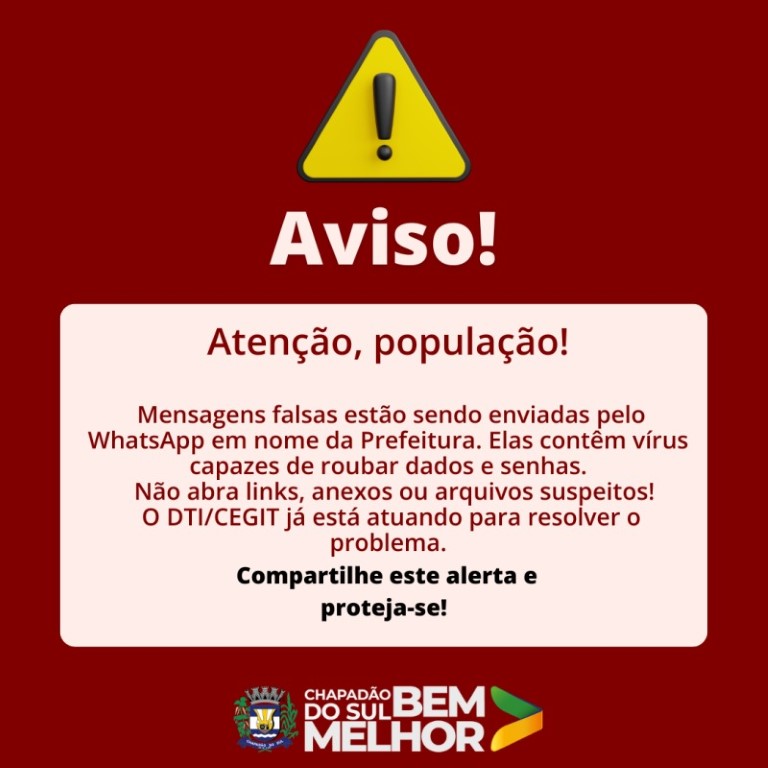 A Prefeitura de Chapadão do Sul emitiu um alerta à população após a descoberta de mensagens falsas contendo vírus em sistemas invadidos. O objetivo dessas mensagens é infectar os dispositivos dos usuários, comprometendo a segurança de dados pessoais e bancários. O alerta foi feito através de um comunicado oficial da Secretaria Municipal de Segurança e Tecnologia.
