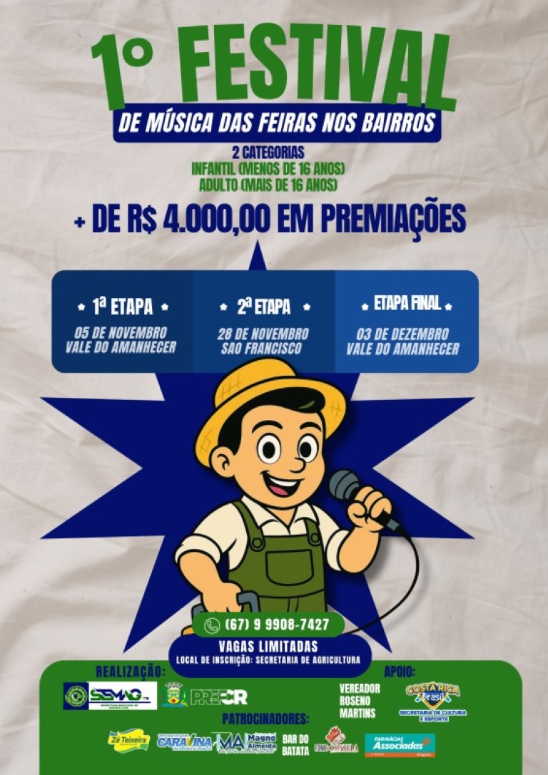 A Secretaria Municipal de Agricultura de Costa Rica abriu inscrições gratuitas para o 1º Festival de Música das Feiras nos Bairros, que ocorrerá nos bairros Vale do Amanhecer e São Francisco. As inscrições seguem até 31 de outubro e são limitadas a 40 vagas.