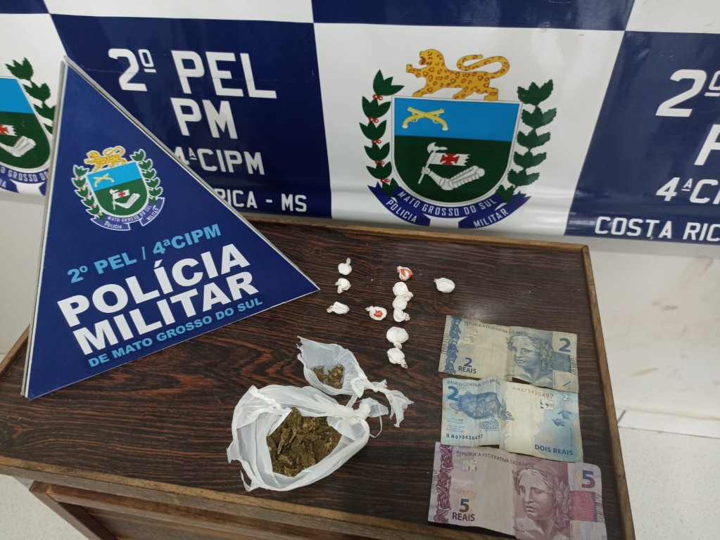 Durante a abordagem, os militares encontraram uma trouxinha de maconha sobre uma mesa e, no interior do local, apreenderam um pote com “balas” de cocaína, outra trouxinha de maconha e um celular. O material somou 11 trouxinhas de cocaína (7,59 gramas) e duas de maconha (6,73 gramas). O suspeito foi preso e encaminhado à Delegacia de Polícia Civil.