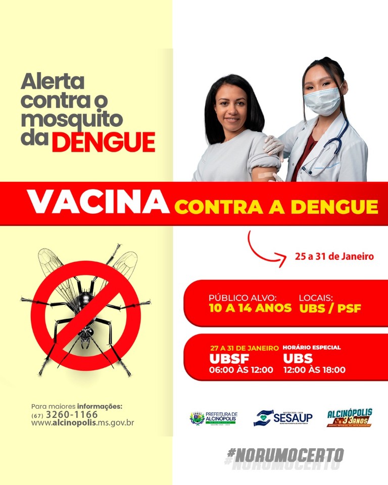Alcinópolis está realizando uma campanha especial de vacinação contra a dengue, com doses gratuitas disponíveis até o dia 31 de janeiro. A ação é uma medida preventiva para reduzir os riscos de complicações causadas pela doença, que representa uma preocupação constante para a saúde pública.