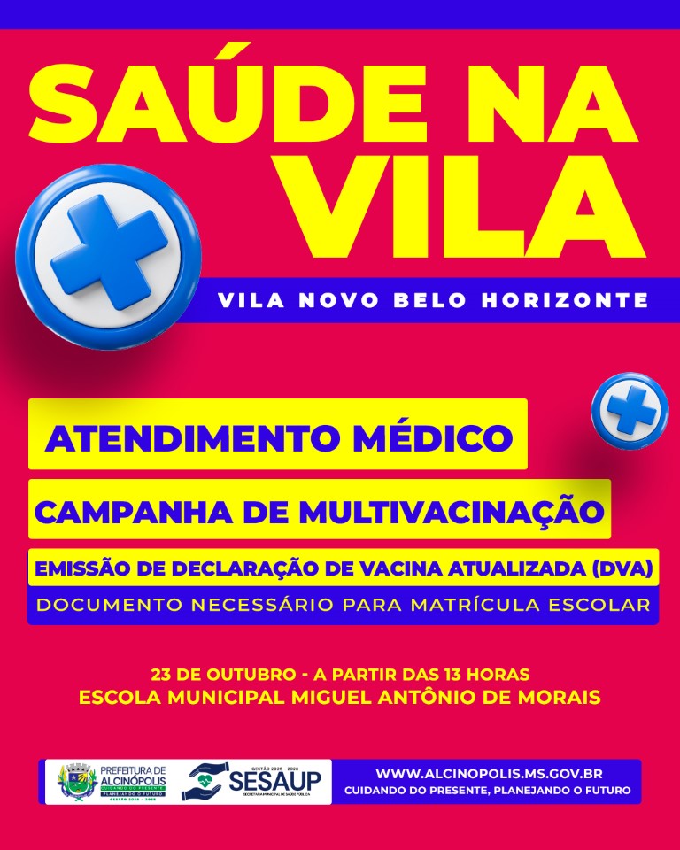A Prefeitura de Alcinópolis, por meio da Secretaria Municipal de Saúde, realizará uma ação de atendimento médico e vacinação na Vila Novo Belo Horizonte, na quinta-feira, 23 de outubro, a partir das 13h.