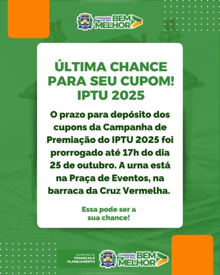 A Prefeitura de Chapadão do Sul confirmou que o prazo para o depósito de cupons da campanha de premiação do IPTU 2025 foi estendido, permitindo que mais contribuintes participem da iniciativa.