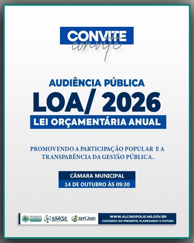 A administração de Alcinópolis convocou audiência pública para discutir a proposta da Lei Orçamentária Anual (LOA) de 2026. O encontro está marcado para esta terça-feira (14), às 9h30, no plenário da Câmara Municipal.