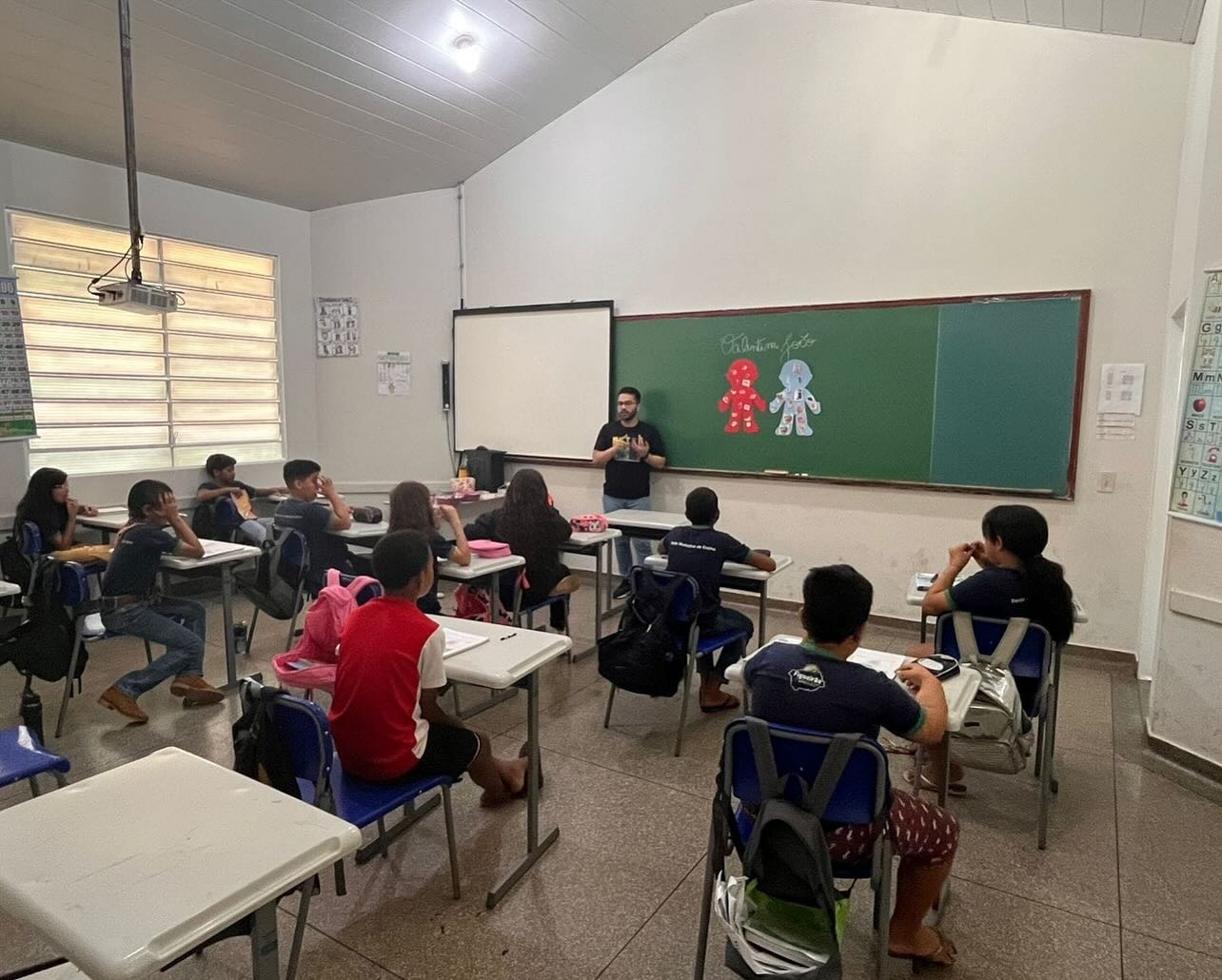 A atividade “Alimentando o corpinho” utilizou uma dinâmica em que os alunos escolheram imagens de alimentos e as associaram a dois bonecos, explicando quais alimentos eram benéficos e quais, quando consumidos em excesso, poderiam prejudicar a saúde. Os nutricionistas destacaram a importância de hábitos alimentares saudáveis para o crescimento e o bem-estar das crianças.
