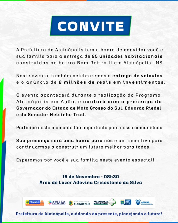 Além da entrega das moradias, a Prefeitura fará a entrega de veículos e maquinários destinados às secretarias municipais, reforçando a estrutura administrativa e os serviços públicos.